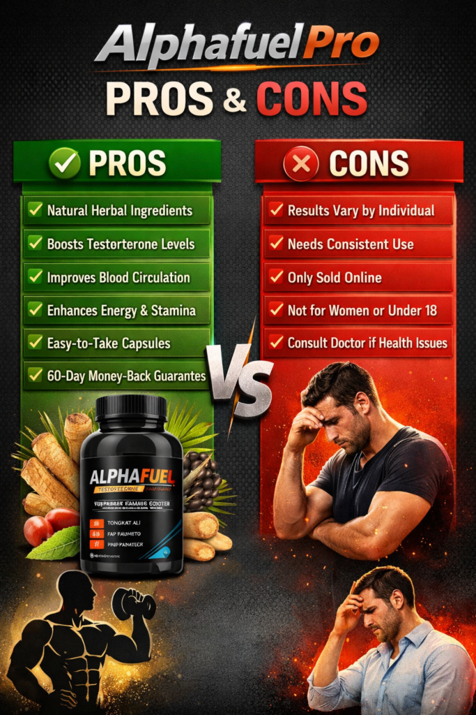 One of the key advantages of Alphafuel Pro is its use of plant-based ingredients commonly found in male health supplements, such as Tongkat Ali, Horny Goat Weed, and Saw Palmetto. These ingredients may help support hormonal balance, improve blood flow, and increase endurance when used consistently over time. The product is also backed by a 60-day money-back guarantee, allowing users to try it with relatively low risk.