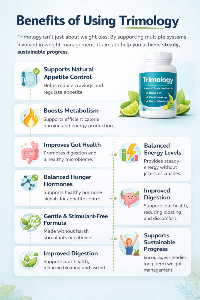 Before exploring the benefits, it’s worth noting that Trimology supports multiple systems involved in weight management — including metabolism, digestion, and appetite control. By helping your body function more efficiently, it aims to promote steady, sustainable progress rather than quick, temporary results.